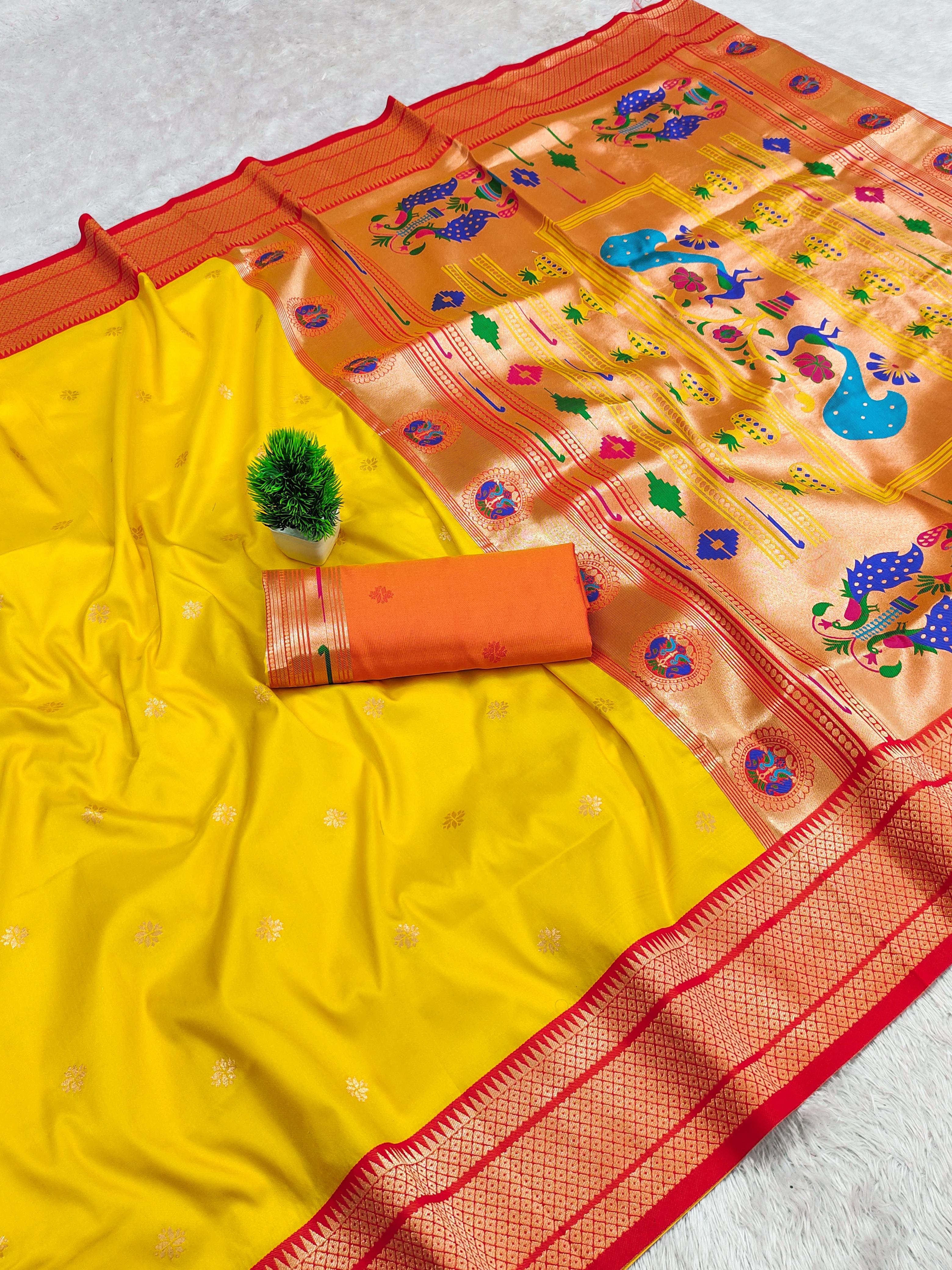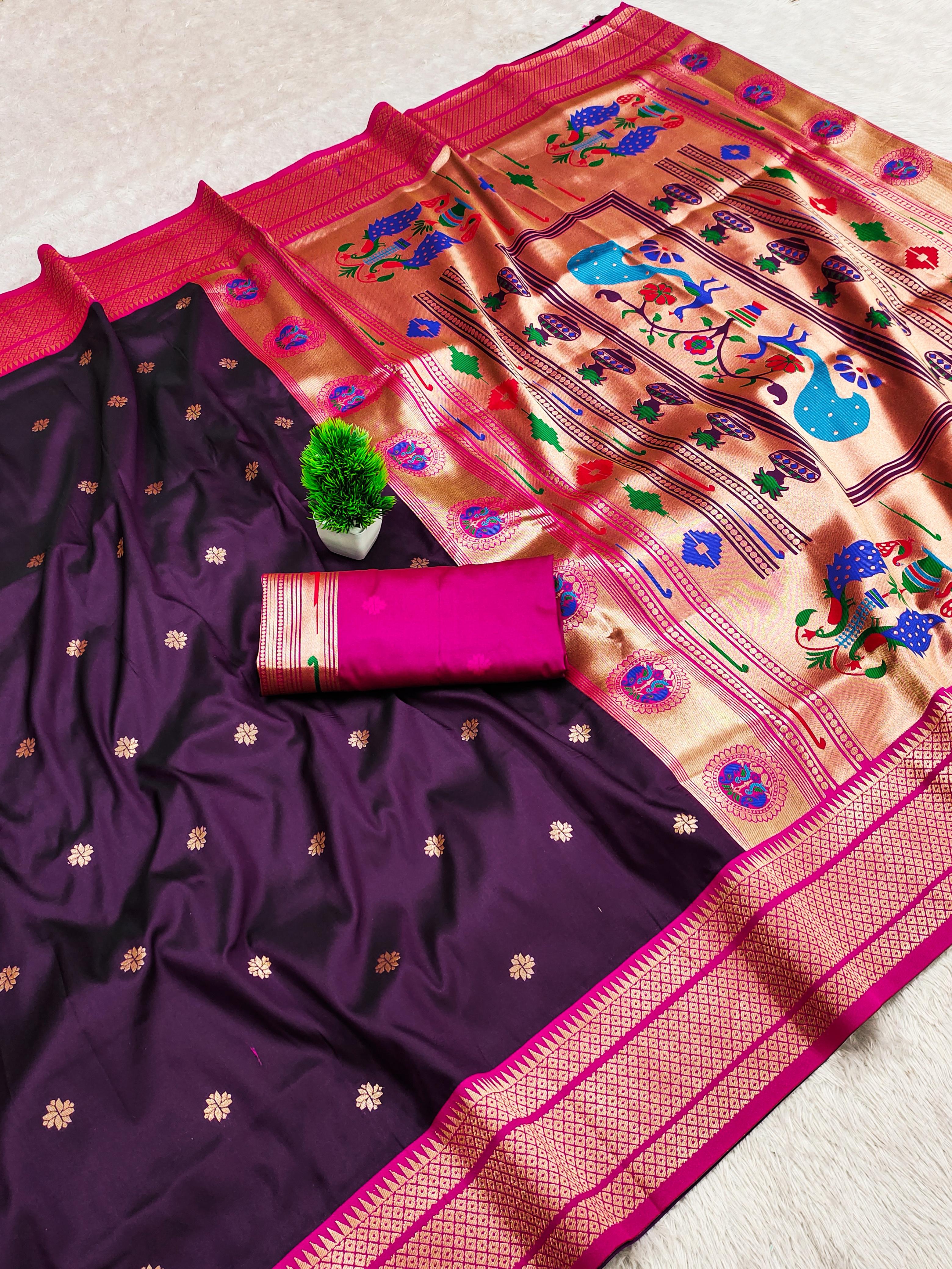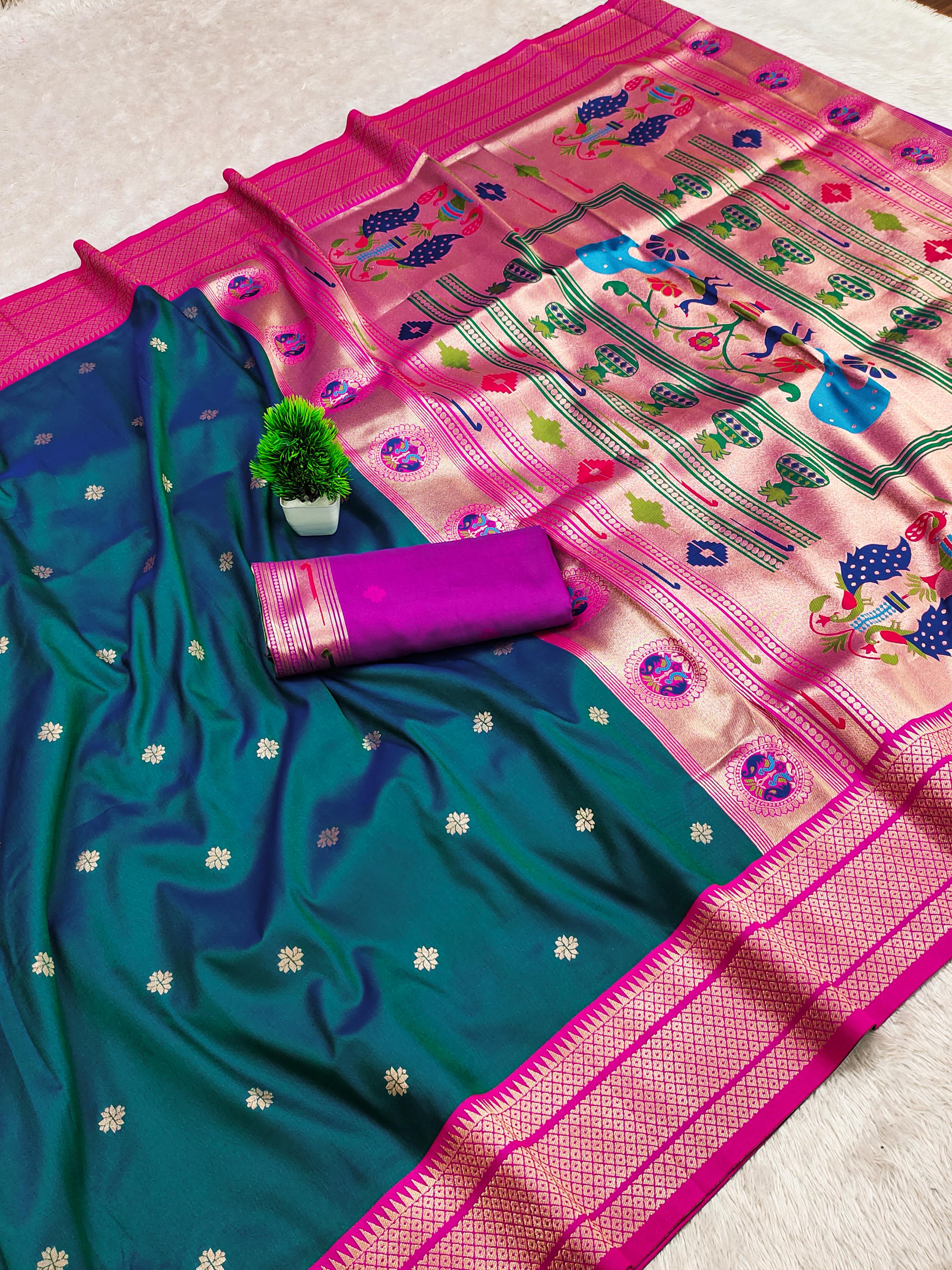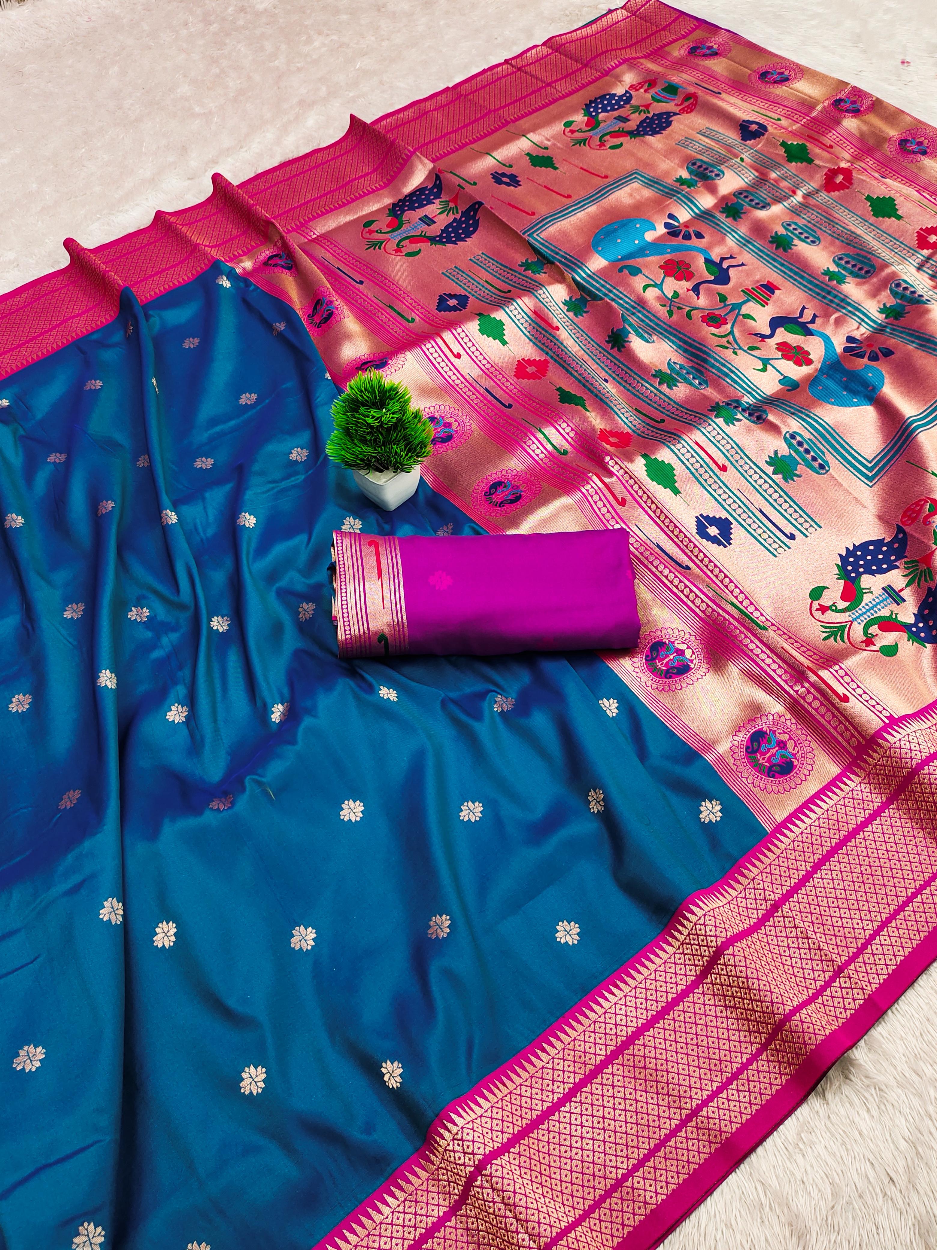 Elevate your ethnic wardrobe with this exquisite Paithani Silk Saree, crafted from pure soft Narayanpet Paithani silk. Designed with original pure zari weaving, the saree features a rich Minakari traditional pallu and border that reflect timeless elegance. Paired with a contrast jacquard weaving blouse with heavy zari patta, this saree is a perfect blend of tradition and sophistication. Ideal for weddings, festive occasions, and cultural celebrations, it is a statement piece that embodies luxury and heritage.